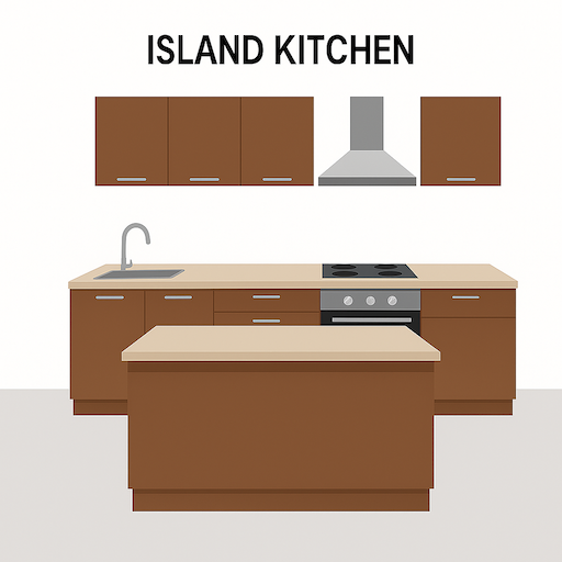 Layout: Includes a central island apart from the main counters (L or U-shaped base).